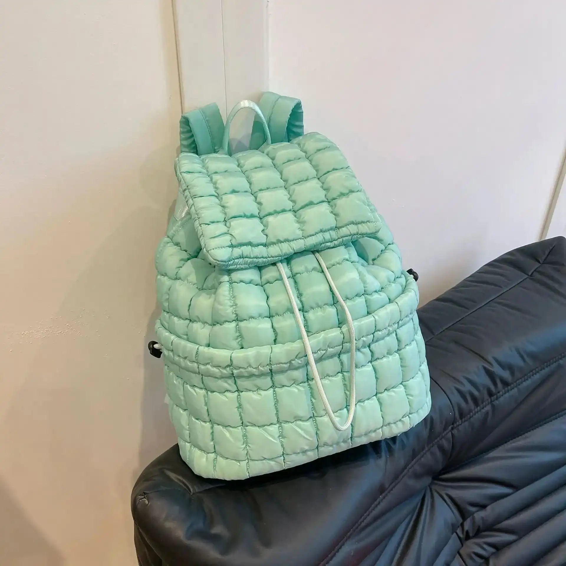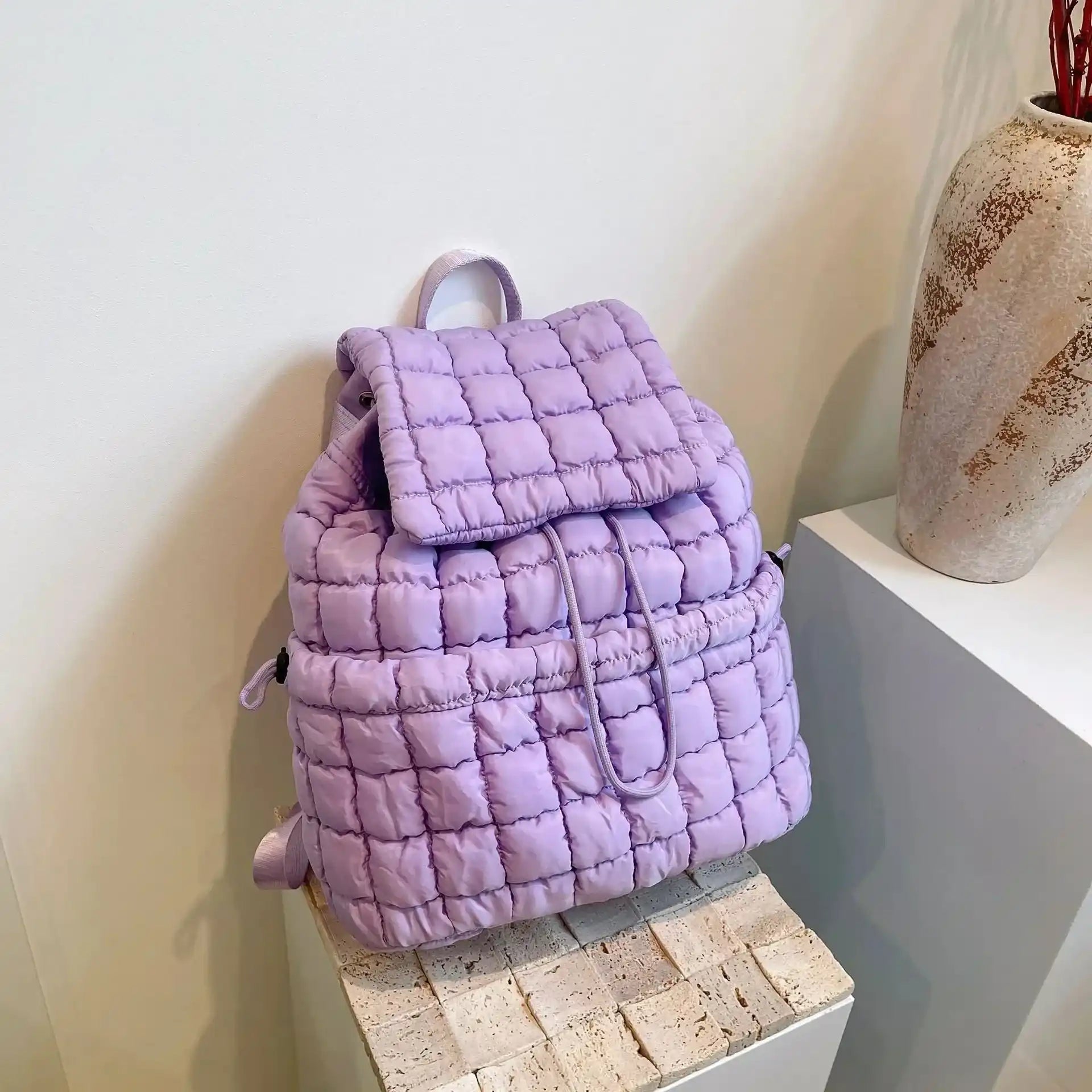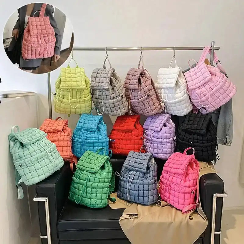 Introducing our Quilted Puffy Down Backpack. This puffer backpack is made of durable and soft nylon, has two padded shoulder straps and offers lightweight carrying and of force reinforcement. Essential backpack for autumn and winter. Simplicity, softness, versatility, multiple pockets, sturdy, light and comfortable.