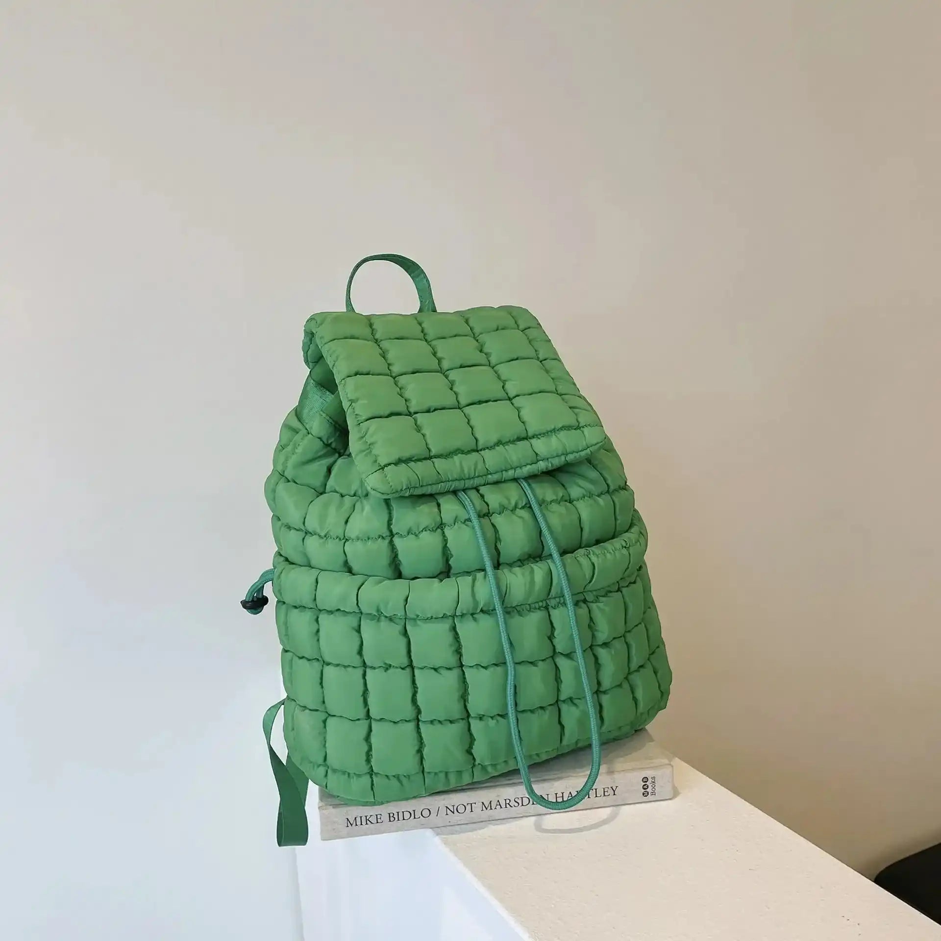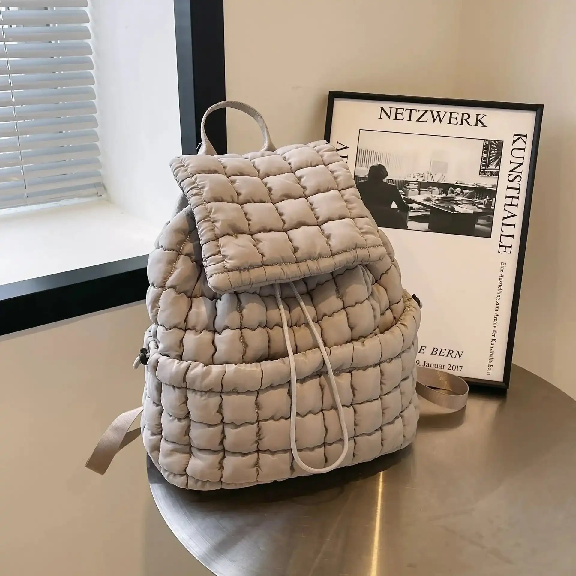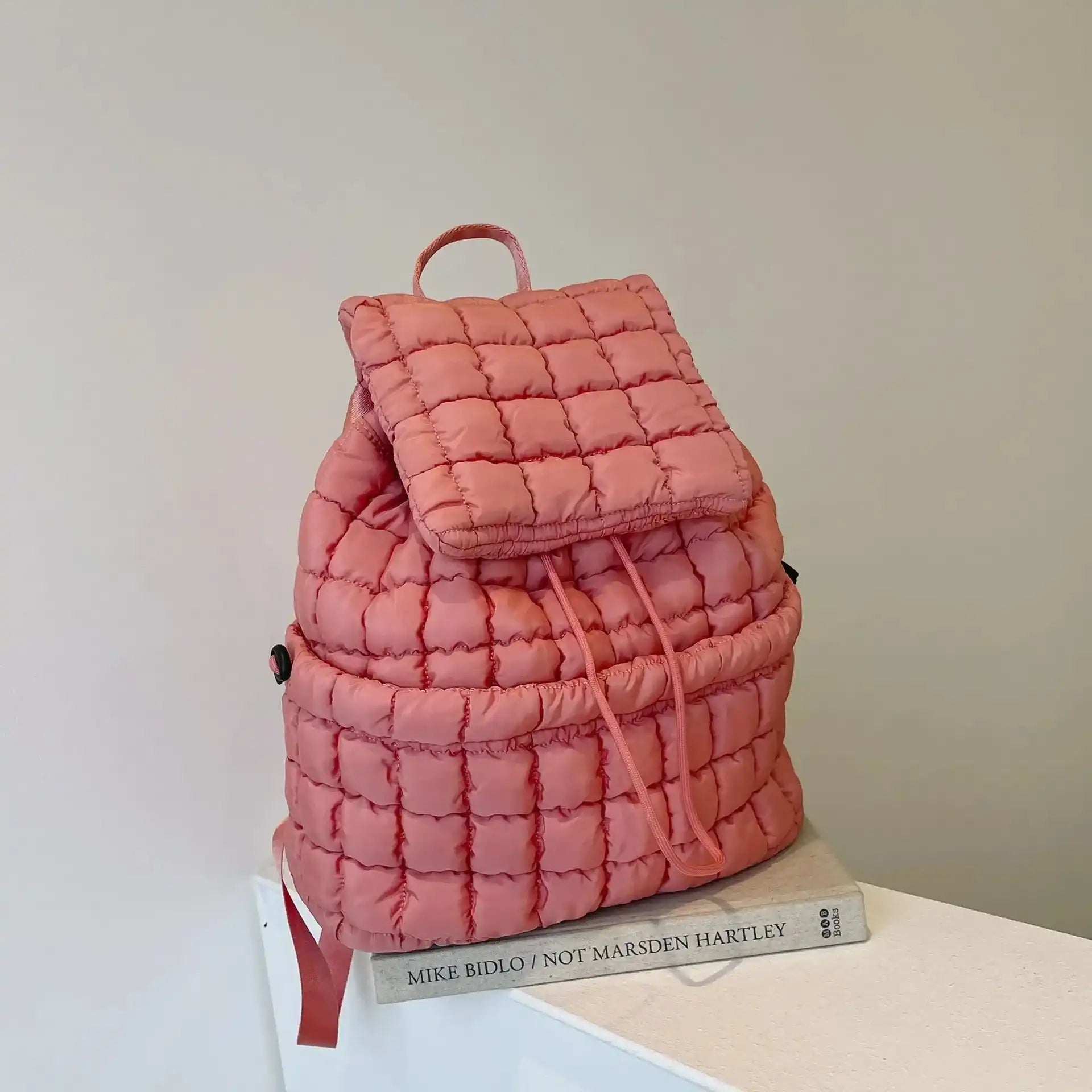 Introducing our Quilted Puffy Down Backpack. This puffer backpack is made of durable and soft nylon, has two padded shoulder straps and offers lightweight carrying and of force reinforcement. Essential backpack for autumn and winter. Simplicity, softness, versatility, multiple pockets, sturdy, light and comfortable.